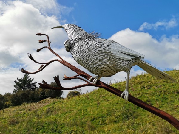 On the Karapiro section is the tui sculpture that towers above the giant toe toe tussock grasses on the hillside. The sculpture was formed from corrugated iron by local artist Steven Clothier in nearby Tirau, dubbed the "corrugated iron capital of the world".