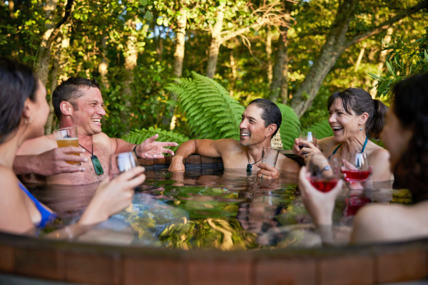 Surrounded by lush nikau bush, relax in the fresh, clean spring water in one of three tubs that seat up to six people.