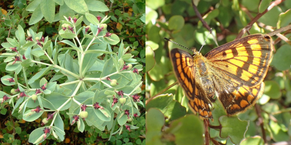 Waiū-atua (left – iNaturalist), and the Copper Butterfly perched on some Pohuehue (right – Jim Robinson).