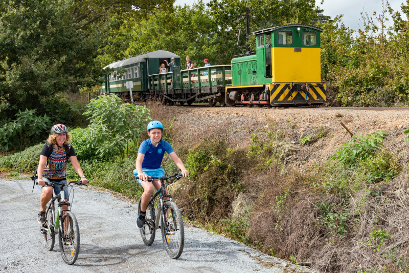 Racing the vintage train on the Twin Coast Cycle Trail between Ōpua and Kawakawa (Ruth Lawton Photography)