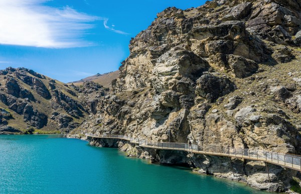 A fabulous and new addition to Ngā Haerenga Great Rides of New Zealand, the Lake Dunstan is one of the most memorable day rides in the country if not the world... The whole 41km trail from Cromwell to Clyde is an easy–intermediate (Grade 2–3), five to eight-hour ride that'll blow your mind as it winds beside a pretty lake and through a spectacular gorge with clip-on bridge sections that seem to hover above the water. There's even a floating burger bar/cafe pitstop around the halfway point!